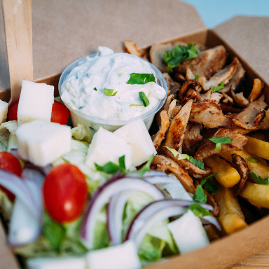 Grillad gyros att välja från grillad halloumi, fläskkarréoch kyckling med grekisk sallad, hemgjord tzatziki och pommes.